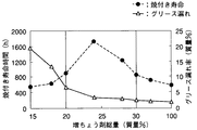 また、グリース組成物中の増ちょう剤の総量、即ち金属石けん、ウレア化合物及びPTFEの総量を20〜30質量%にする。グリース組成物中の増ちょう剤総量が20質量%未満であると、離油が大きいこと、せん断安定性に劣ることなどから、グリース漏れが発生し、焼付き寿命が短くなる。また、30質量%を超えると、グリース組成物の流動性が大きくなり、軸受内外輪と転動体との転走面にグリースが入り込まなくなるため、焼付き寿命や、低温性に問題が出てくる。