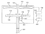 同図に示すように、円筒形のチャンバー104は、回転ディスク109を収容し、回転ディスク109はその上面に複数のウェハ101を搭載している。回転ディスク109はその中心を下方から中空シャフト110によって水平に支持され、中空シャフト110は図示しないモータに機械的に接続され、そのモータによって回転ディスク109が水平に矢印A方向に回転するようになっている。