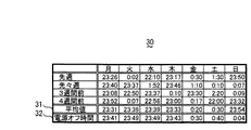 制御部19は、電源のオン/オフ動作が行われると、電源オン情報及び電源オフ情報を、メモリ17内の複数のテーブルに所定の時間区分毎に整理して格納する。図3に、上記のテーブルの例として、時間区分22:00から26:00(04:00)までの電源オフ情報を記憶するテーブルを示す。テーブル30には、曜日ごとに過去4週間分の電源オフ情報が記憶されており、制御部19は、図4に示されるような流れで、ユーザのテレビ視聴時間帯を解析して、自動的に電源オフにする時間32(以下、電源オフ時間という)を決定する。