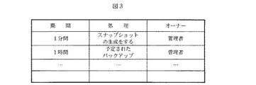 図3は、スナップショットのスケジューリング用のファイルを示したものである。示されている様に、このファイルは、各項目毎に期間、処理、オーナーを含んでいる。図3に示された例では、スナップショットは、これは一分毎に取得されるが、第一の行に示されており、一時間毎に起きる様に予定されたバックアップオペレーションは、第二の行に示されている。