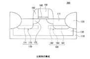 図2は、比較のためのMOSFET200の構造を概略的に示す断面図である。図2に示したMOSFET200は、高濃度不純物領域170の下端面173と重なるようにポケット領域180が形成されている点が、本実施形態のMOSFET100(図1参照)と異なっている。また、図3は、本実施形態のMOSFET100と比較用のMOSFET200との不純物濃度分布を比較するためのグラフである。図3において、縦軸は不純物濃度(この例ではヒ素)であり、横軸は深さである。図3から解るように、本実施形態のMOSFET100は、高濃度不純物領域170の下端面173と重ならないようにポケット領域180が形成されているので、下端面173におけるヒ素濃度(図3の符号A1参照)が、比較例のMOSFET200の下端面173におけるヒ素濃度(図3の符号B1参照)よりも、ΔDだけ小さくなる。