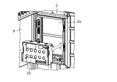 更には図1(c)に中扉9を開けた状態を示すように、前記中扉9の裏面側、つまり商品コラム9aの裏面側には前述した商品展示棚3aが多段に設けられている。これらの商品展示棚3への商品見本の載置(展示)等は、この図1(c)に示すように中扉9を開けて行われる。また前述した広告ユニット10の前扉2への装着も、上述したように中扉9を開けた状態で前記前扉2の裏側から行われる。
