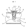 図2は、本発明の空気流量計の実装状態の断面構造を示したものである。本発明の空気流量計は通路管28内に挿入され、フランジ20によって通路管に固定される。通路管内には回路基板25の一部が納められる密閉室21と通路管内の空気を分流するバイパス通路22が曲がり通路管23を介してバイパス通路出口24から空気が排出される。このバイパス通路内の空気流量は回路基板25上に実装された空気流量検出素子27の周囲を通り、流量が抵抗変化に変換され検出される。検出された流量信号は回路基板上の回路素子26によって増幅され出力される。通常は流れ方向29に空気が流れているが、エンジンの脈動によって一次的には逆方向30にも空気が流れる。本発明の空気流量計はこの順逆両方向の空気を測定することができる。