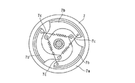 また、図2に示すように、エンジン2の駆動力は、プライマリシーブ6によってVベルト11の回転力に変換されるとともに、Vベルト11の回転力はセカンダリシーブ10を介して遠心クラッチ7に伝達される。この遠心クラッチ7は、図4に示すように、クラッチドラム7aと、クラッチドラム7aの内周面と対向するように配置された3つのクラッチ片7bと、3つのクラッチ片7bをそれぞれ連結する3つのクラッチスプリング7cとを有している。このクラッチドラム7aは、減速機構8(図2参照)を介して後輪3に接続されている。また、3つのクラッチ片7b(図4参照)は、セカンダリシーブ10(図2参照)に接続されている。また、クラッチ片7bは、図4に示すように、セカンダリシーブ10(図2参照)の回転速度が大きくなるに従ってクラッチスプリング7cの付勢力に抗して遠心力によりクラッチドラム7aの内周面に近づく。そして、セカンダリシーブ10の回転速度が所定の値以上になると、図5に示すように、クラッチ片7bは、クラッチドラム7aの内周面に接するとともに、セカンダリシーブ10(図2参照)から後輪3に駆動力が伝達される。