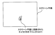First, a character object CH1 is projected onto a screen plane, and a circular area centered on the position of the character object CH1 projected onto the screen plane is drawn as a mask area. The image data obtained in this way is stored as mask data in the main memory and used when drawing each object in the virtual game space. A transparency flag is set in advance for each field object OB1 to OB3. A field object OB1 with a transparency flag of 1 is drawn using mask data, and a character object CH1 and a field object OB2 with a transparency flag of 0 are drawn. , OB3 is drawn normally.