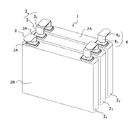 電池モジュール1は、図1に示すように、複数個、例えば3個のリチウムイオン電池(以下、電池という)21〜23でモジュール化されている。これらの電池のそれぞれは、その一つの電池2を図2に示すように、それぞれ金属製ケーシング2Bの上面2Aに板状の正極端子3及び負極端子4が突き出されている。そして、金属製ケーシング2B内には図示しない正極板、負極板、セパレータ及び電解液が収容されている。