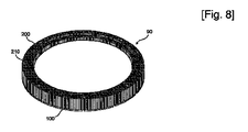図7及び図8は、本発明に係るウェーハリテーニングリング90を示す図面であって、複数のリテーニング断片100が、略環状を有するベースリング200に付着されている。リテーニング断片100は、CMP工程中にウェーハの側面を支持することによってウェーハの離脱を防止する役割を行い、ベースリング200は、リテーニング断片が付着されている場所であって、図7をひっくり返した図面である図8に示すように、上面にねじ孔210が形成されることによって、ねじを利用してキャリアベース(図示せず)に固定させる。リテーニング断片100の他の役割は、CMP工程中に研磨パッドを所定の圧力で押して、ウェーハエッジの付近で研磨パッドの変形を均一化することである。