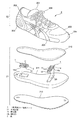 まず前記靴2について図示の実施例に基づいて具体的に説明すると、このものは一例として図1に示すように、装着者の足を包むように覆うアッパー20と、靴底21とを具えて成り、これらが適宜、接着や縫製によって一体化されて成るものである。