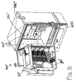 図4〜5を参照する。スイング・フレーム300のストレッジ領域313は、終端領域311の下に位置する。しかしながら、他の実施形態においては、ストレッジ領域313が、終端領域311より上にまたは隣接することができる。一般に、終端領域311は終端モジュール400からのアダプタ450(図13A、図13B参照)が伸びる少なくとも1つの矩形開口部312を規定する。終端モジュール400は、本願明細書において、更に詳細に記載されている。図4に図示した実施形態において、終端領域311は、開口部312の2つの列を含み、各列は、12の長形スロットを含んでいる。ストリップ片309は、各列の開口部312を切り離しており、表面に粘着ラベルで、コネクタ指定等の情報を表示できる。ストレッジ領域313も、ストレッジ・モジュール600(図9を参照)が取り付けられる1つ以上の開口部314を規定する。ストレッジ・モジュール600は、本願明細書において、更に詳細に記載されている。
