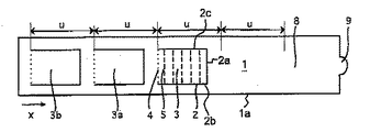 U字形は、2つの互いに平行またはほぼ平行に走る2つの区間2b、2cを有しており、これらの区間は末端で、この区間に対して横または垂直に走っている第1の区間2aを介して相互に繋がっている。U字形の全部の線2b、2a、2cに沿って、材料層1は完全に切断されている。U字形の第1の区間2aは、折り目線4に平行またはほぼ平行に延びている。区間2b、2cは、材料層1のうち長手延長方向xに走っている側縁に平行またはほぼ平行に延びている。