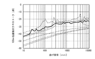 そして、比較例1と同様の光をそれぞれのコアに伝播させて、比較例1と同様にしてマルチコアファイバを徐々に曲げたときにおける、中心のコアと外周側のコアとのクロストークの変化を調べた。この結果を図25に示す。なお、図25において、波線はそれぞれのコアのクロストークを示し、実線は、平均値を示す。さらに、マルチコアファイバを曲げる方向を維持しつつ、マルチコアファイバを軸中心に回転させて、それぞれの曲げ直径において、クロストークの最大値、及び、最小値、及び、平均値を調べた。この結果を図26に示す。なお、図26において、波線は、それぞれ最大値、最小値を示し、実線は、平均値を示す。また、図25、図26に示すクロストークは、光を100m伝搬した後の値である。 Then, when the same light as in Comparative Example 1 is propagated to the respective cores and the multicore fiber is gradually bent in the same manner as in Comparative Example 1, the change in crosstalk between the central core and the outer peripheral core is shown. Examined. The result is shown in FIG. In FIG. 25, the wavy line indicates the crosstalk of each core, and the solid line indicates the average value. Furthermore, the multicore fiber was rotated about the axis while maintaining the bending direction of the multicore fiber, and the maximum value, the minimum value, and the average value of the crosstalk were examined at each bending diameter. The result is shown in FIG. In FIG. 26, the wavy line indicates the maximum value and the minimum value, respectively, and the solid line indicates the average value. Moreover, the crosstalk shown in FIG. 25 and FIG. 26 is a value after propagating light for 100 m.