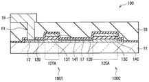 この酸化物半導体膜12は上層のゲート電極14Tに対向し、ゲート電極14Tに重なる重畳領域12TAを有している。酸化物半導体膜12には、この重畳領域12TAを間にして一対の低抵抗領域12B(ソース・ドレイン領域)が設けられている。低抵抗領域12Bは、重畳領域12TAよりも電気抵抗率の低い領域であり、例えば酸化物半導体膜12の表面(上面)から厚み方向の一部に設けられている。この低抵抗領域12Bは、例えば、酸化物半導体材料にアルミニウム(Al)等の金属を反応させて金属(ドーパント)を拡散させることにより形成されたものである。トランジスタ10Tでは、この低抵抗領域12Bによりセルフアライン(自己整合)構造が実現される。また、低抵抗領域12Bはトランジスタ10Tの特性を安定化させる役割をも有するものである。