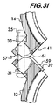 軸の周りでの旋回運動以外のセグメント間の相対運動を防止する突出部対31および33の境界面に、特徴部を組み込むことが望ましいとし得る。図29は、例示的な枢着部の実施形態57を示し、境界曲面39および41(図示せず)は、突出部31の一方の側部に位置決めされた突出リブ59と、突出部の他方の側部に凹部61とを有する。使用時には、図30および図31に示すように、セグメント12および14は、一方のセグメントの突出リブ59が他方のセグメントの凹部61内に嵌合するように、およびその逆となるように、位置合わせされる。リブと凹部との相互作用は、枢着部におけるセグメントの相対的な軸方向運動を防止し、それにより、それら相互の整列を維持する。