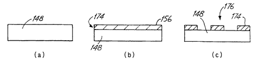本発明の1つの特徴は、a)基板と、この基板上のパターンに適合(conformable)するように配置されたマスク(以下、適合マスクという)を含む第1の物品(article)に第1の基板を接触させ、b)適合マスクのパターンと相補的に(complement)対応する第1のパターンで、金属イオン源から第1の金属を第1の基板の上に電気めっきし、c)第1の基板から第1の物品を取り除くこと、を含む電気めっき方法にある。 One feature of the present invention is that a) a first article in a first article comprising a substrate and a mask (hereinafter referred to as a conforming mask) arranged to conform to a pattern on the substrate. Contacting the substrate, b) electroplating a first metal from a metal ion source onto the first substrate in a first pattern that corresponds complementarily to the pattern of the matching mask, and c) first Removing the first article from the substrate.