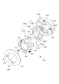 図3は、第1補正レンズ103と像振れ補正レンズ駆動部104の機械的な構成例を示す分解斜視図である。以下、光軸に近づく側を内周側と定義して各構成部の位置関係を説明する。可動鏡筒122は、中央の開口部に第1補正レンズ103を保持し、外周部にて第1磁石1251および第2磁石1261を保持する。また可動鏡筒122は、転動ボール受け部を3個所に備えており、3個の転動ボール124によって、光軸と直交する面内を移動可能に転動支持される。可動鏡筒122は、3個の付勢ばね127の一端をそれぞれ保持するために、ばねかけ部を3個所に備えている。