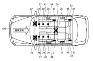 エアバッグ32は、例えば、運転席41の前方および助手席42の前方に設けられる。カーテンエアバッグ33は、例えば、車室内の左右両窓側上部に設けられる。ニーエアバッグ34は、例えば、運転席41の乗員の膝元および助手席42の乗員の膝元に設けられる。