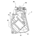 また、図8から図10に示すことから理解されるように、左側ケース201と右側ケース202は、その上部側に回転部材82を挟持する。この回転部材82は、円盤部83と軸部84で構成され、円盤部83の上面や、軸部84の周囲には、回転部材82を回転しやすくするための樹脂などが付されている。なお、支持部81となるボルトを軸部84に対して下側から挿入し、ボルトを取付部40の支持部材42の支持孔47に固定することで、回転部材82を支持し、更には、回転部材82を挟持するケース部20を支持する。