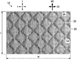 成形不織布10の代表的な実施形態の写真が図1〜3に示されている。成形不織布10は、第1の表面12及び第2の表面14を有するスパンボンド不織布基材であってよい。図1〜3では、第2の表面14が観測者に面していて、第1の表面12の反対側であり、第1の表面12は見えていないが図4に示されている。「表面」なる用語は、説明の目的でウェブの両面のことを指して広い意味で用いられており、いっさいの必要な平坦度又は平滑度を示唆することも意図していない。成形不織布10は柔軟かつ可撓性であるが、図1〜3に示されるように、平坦な状態に平行な、ウェブ製造技術においてはそれぞれ横断方向(CD)及び縦方向(MD)の平面に対応する1つ以上のXY平面に関連して平坦な状態で説明する。MD方向の長さL及びCD方向の幅Wにより、布地10の全体の面積Aが決まる。図1に示される布地10の一部の断面である図4に示されるように、説明の目的で、成形不織布の三次元形成要素は、第1の表面16のXY平面からZ方向に外側に延在するものとして説明されている(図4を参照)。一実施形態では、Z方向の三次元形成要素の最大寸法は、第1の表面16の平面と第2の表面18のXY平面との間の最大距離として定義され、この距離は成形不織布10の平均厚さACとして測定することができる。平均厚さは光学的な非接触的手段によって測定するか、又は間隔を空けて配置された平坦なプレート間に所定の圧力下で置かれた不織布の厚さを測定する器具によって測定することができる。すべての三次元形成要素が同じZ方向の最大寸法を有する必要はないが、複数の三次元形成要素は、下記に述べる紡糸プロセス及び形成ベルトの特性によって決まるほぼ同じZ方向の最大寸法を有することができる。