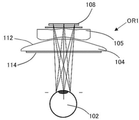 また本実施例のHMD101では、図4に示すように、右眼102の眼球(瞳)が右眼用表示素子108の表示面の左右の端部を向いている(見ている)状態での右眼用接眼光学系OR1の射出瞳ER1′の位置、すなわちアイレリーフE1′を、図1に示すように眼球が表示面の中心部を向いている状態でのアイレリーフE1=18mmに眼球の回転半径10mmを加えた28mmに設定し、射出瞳径を6mmに設定している。左眼用接眼光学系OL1の射出瞳についても同様である。このように設定することで、表示面の左右の端部(同様に上下の端部)を観察するために眼球が回転した場合でも、眼球が向いた方向からの光が眼球に入射させることができる。