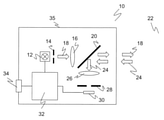 制御及び評価ユニット32が発光器12及び受光器30と接続されている。このユニットは発光器12の時間挙動及び他の特性を制御すると共に、受光器30の受光信号に基づいて監視領域22内の物体を検出する。また、距離測定型の光検知器としてのセンサ10の実施形態では、光パルスを送出してその受光までの光伝播時間を測定することにより、検出された物体の距離も測定される。出力34を通じて評価ユニット32は、処理された又は生のセンサ測定データ、例えばスイッチ信号や測定された距離を出力したり、逆に制御及びパラメータ設定の指示を受け取ったりする。