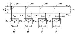 図2に示すように、CANバス1は、CAN_Hライン1H及びCAH_Lライン1Lの2本のバスラインを有し、CAN_Hライン1H及びCAH_Lライン1Lによって差動信号を伝送する。CANバス1には、引き込み線2Ha,2La、引き込み線2Hb,2Lb、引き込み線2Hc,2Lc、引き込み線2Hd,2Ldをそれぞれ介してCANノード3a~3dが接続される。なお、引き込み線2Ha~2Hdを区別する必要がない場合には代表して引き込み線2Hといい、引き込み線2La~2Ldを区別する必要がない場合には代表して引き込み線2Lといい、引き込み線2Ha~2Hd,2La~2Ldを区別する必要がない場合には代表して引き込み線2という。また、CANノード3a~3dを区別する必要がない場合には代表してCANノード3という。