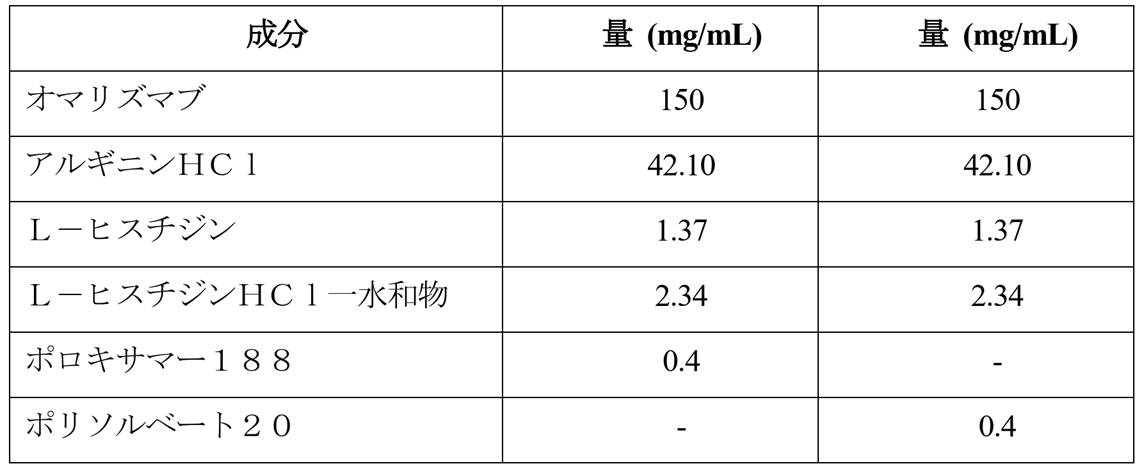 特許文献1は、皮下投与に特に適した抗体の高濃度製剤を開示している。更に、アルギニン-HCl、ヒスチジン、及びポリソルベートなどの様々な賦形剤を使用したオマリズマブの製剤についても記載している。 US Pat. No. 5,300,000 discloses a highly concentrated antibody formulation particularly suitable for subcutaneous administration. Additionally, formulations of omalizumab using various excipients such as arginine-HCl, histidine, and polysorbate are described.
