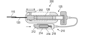 筐体は、チャネル(例えば滑動チャネル)をさらに備えることがある。第1のアクチュエーターは、近位位置と遠位位置との間のチャネル内で軸方向に移動するようになっている第1の滑動トリガーを含むことがあり、第2のアクチュエーターは、近位位置と遠位位置との間のチャネル内で軸方向に移動するようになっている第2の滑動トリガーを含むことがある。第1の滑動トリガーが近位位置にあるとき、カテーテルの遠位端は、カニューレの近位端と遠位端との間に位置する。第1の滑動トリガーが遠位位置にあるとき、カテーテルの遠位端は、カニューレの遠位端を過ぎて進んでいる。近位位置と遠位位置との間の第2の滑動トリガーの動き(例えば軸方向の動き)は、予め定められた量の流体がカテーテルの遠位端を通って分与される原因となることがある。いくつかの実体化において、チャネルに沿った第2の滑動トリガーの軸方向の動きの量は、カテーテルから分与される流体の量に対応する。 The housing may further comprise channels (eg, sliding channels). The first actuator may include a first sliding trigger adapted to move axially within the channel between the proximal position and the distal position, and the second actuator may move to the proximal position. and a second sliding trigger adapted to move axially within the channel between the and the distal position. When the first sliding trigger is in the proximal position, the distal end of the catheter is located between the proximal and distal ends of the cannula. When the first sliding trigger is in the distal position, the distal end of the catheter has advanced past the distal end of the cannula. Movement (e.g., axial movement) of the second sliding trigger between the proximal and distal positions causes a predetermined amount of fluid to be dispensed through the distal end of the catheter. Sometimes. In some implementations, the amount of axial movement of the second sliding trigger along the channel corresponds to the amount of fluid dispensed from the catheter.
