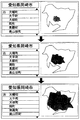 以下同様にして図5、図6、図7のように階層的に選択、決定していき、最終的に使用者が所望する住所を番地のレベルまで検索することが可能である。なお、請求項で述べられている第1階層と第2階層の関係は、上記実施例のように、第1階層を例えば「愛知県」とすると、第1階層の下位である第2階層は愛知県内に存在する市町村である「岡崎市」である。また、第1階層と第2階層を「愛知県」と「岡崎市」とすると、第1地図描画手段とは愛知県の地図を描画するものであり、第2地図描画手段とは岡崎市の地図を描画するものである。