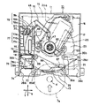 Furthermore, since the opening / closing shutter 13 is always urged to the front side by the compression coil spring 37, the drive lever 13d moves relatively to the front side by the backward movement of the cam plate 18, and is provided at the front end portion of the cam plate 18. It will come off to the front side through the cam part 74. Therefore, the opening / closing shutter 13 changes from a slightly upward state shown in FIG. 39 to a slightly downward state shown in FIG. Thus, the lower surface of the shutter portion 13a comes into contact with the disc guide portion 29 of the main chassis 11 so as to be pressed, and the inside of the disc entrance 30 is closed without a gap by the shutter portion 13a.