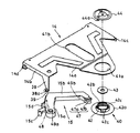 更に、チャッキングアーム14の一方の側面部14bには、下方に突出する駆動レバー38が設けられている。この駆動レバー38の先端部には側方に突出する軸ピン38aが設けられ、この軸ピン38aにはコロ39が回転自在に支持されている。また、チャッキングアーム14のアーム部14aの先端部には、チャッキング部材40を支持するための貫通穴41aが設けられている。この貫通穴41aによって支持されるチャッキング部材40は、図18に示すように、チャックプレート42とヨーク43とヨーク押え44とから構成されている。
