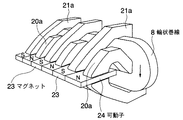 前記各磁極歯20a、21aに形成されたスリット状の空隙22は直線状に整列され、この空隙22には複数のマグネット23を有する可動子24が往復動自在に配設されている。