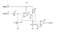 入力端子SENSE2の入力電圧V2は、定電流源34に流れ込む電流が抵抗31に流れることにより下降し、増幅器35の非反転入力端子の電圧はV2−Ia×Raとなる。そして、この電圧はP型MOSトランジスタのソース電圧となる。もし、入力端子SENSE1及びSENSE2の電圧V1、V2が等しい(すなわち電流検出抵抗12に電流が流れていない)場合は、抵抗32にIa×Ra/Rbの電流が流れ、その電流は抵抗33にも流れるのでP型MOSトランジスタのドレイン電圧はIa×Ra×Rc/Rbとなる。この電圧値を充電電流方向検出用基準電源37の電圧値としておくと、入力端子SENSE1の電圧V1が入力端子SENSE2の電圧V2よりも高い(すなわち電流検出抵抗12に順方向の電流が流れている)場合は出力端子DIRの出力はローレベルになる。入力端子SENSE1の電圧V1が入力端子SENSE2の電圧V2よりも低い(すなわち電流検出抵抗12に逆流の電流が流れている)場合は出力端子DIRの出力はハイレベルになる。こうして、電流検出抵抗12に逆流の電流が流れると、出力端子DIRから検出信号が出力される。