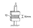 保形片10は、該保形片10を股下部4の幅方向に圧縮したときの圧縮抵抗値(以下、この値を無荷重圧縮抵抗値という)が0.5〜10N、特に1〜8Nであることが、曲げや圧縮に対する回復性を十分に発現させる点から好ましい。無荷重圧縮抵抗値は次の方法で測定される。先ず、ショーツ1から保形片10を取り出し、幅方向(股下部の幅方向に同じ)が圧縮方向となるように、図5に示すように引張試験機のチャックに取り付ける。チャック間距離は15mmとする。このとき、保形片10の縦中心線が、チャック間の中央部に位置するように保形片10を取り付ける。尚、図5では保形片10を矩形状に切り出しているが、特にその必要は無く、保形片10が、チャックに取り付けられる程度の長さ及び幅を有していれば、ショーツ1から取り出したままの状態でチャックに取り付けてよい。チャックに取り付けられた保形片10を、圧縮速度50mm/分で測定片を圧縮していきチャック間距離10mmまで圧縮した時点(=5mm圧縮した時点)での荷重を、無荷重圧縮抵抗値とする。測定は3回行い、その平均値をとる。