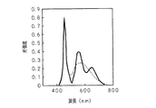 本発明のLEDは、400〜560nmの波長の光を発生するLEDチップ1を用いて構成されている。また被覆部2は、LEDチップ1を凹部3aの底部にダイボンディングした後に、本実施の形態に係る蛍光体を混合したエポキシ樹脂又はシリコーン樹脂等の透光性の樹脂を凹部3a内に充填し、充填した樹脂を加熱して硬化させることにより形成される。LEDチップ1が発生する青色光の一部を被覆部2に含まれる蛍光体が吸収して図3に示す如きスペクトルの光を発生することにより、本発明のLEDは白色光を発生する白色LEDとして機能する。