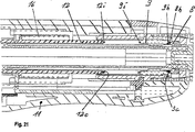 更に、図1及び図2において、リザーバ部分1の反対側で機構ホルダ3の一端にて機構ホルダ3内に突き出すピストンロッドが図示されており、該ピストンロッドは、機構ホルダ3に取り付けられ、該ピストンロッドはピストンロッド4の長手方向軸線Lの前進方向に移動し、機構ホルダ3の反対側を向いたリザーバ部分1の前端に向かう。リザーバ部分1は、円形の断面を有する実質的に中空な円筒体であり、該リザーバ部分は、注射針用の針ホルダに接続するため、その前端に接続領域を備えている。リザーバ部分1は、一例としての実施の形態において、図3の長手方向断面図にて見ることのできるアンプル2によって形成されたリザーバ容器を受け入れる作用を果たす。アンプル2の前端の出口は膜によって流体密に封止されている。針ホルダがリザーバ部分1の前端に締結されたとき、注射針の後側部分が膜を穿刺し、中空の注射針の先端とリザーバ2との間の流体接続が確立されるようにする。