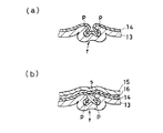図5および図6は、容器本体1が紙13の表面に熱接着性樹脂14を積層したもので、蓋材6がプラスチックフィルム15にピールレジン16を積層したものである場合を示している。この場合、成形された容器本体1のフランジ部4では、図5の(a)に示されるように紙シワfがつぶれ、しかも、熱接着性樹脂14の融点よりも温度の高い雌型22により容器内面側から加熱されて熱接着性樹脂14が溶融し、フランジ部4表面でトンネル状連通孔となる部分を閉塞する。一方、側面部3の紙シワfは、図6に示されるように、つぶれ度合が小さい。それに対し、クリアランス差がなく温度差のない条件でプレス成形した比較例の場合は、図7および図8に示すようにフランジ部4でも側面部3でも同程度に紙シワfがつぶれるが、そのつぶれ度合が比較的小さいために平滑性に欠け、また、フランジ部4表面には図7の(a)に示されるようなトンネル状連通孔pができる。