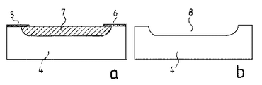 図3aにシリコンウェハ4が示され、シリコンウェハ上に多孔質化した領域をマスキングするために、酸化珪素および窒化珪素からなるマスク5,6を形成する。多孔質シリコン7を除去する前に、まず酸化珪素、窒化珪素または炭化珪素またはこれらの組合せ物からなるマスクを除去することができ、これにより図3bによりくぼみ8が残り、くぼみは周辺領域に図2の実施例のような突出するマスク部分を有しない。