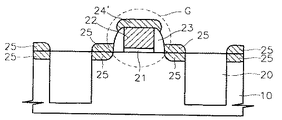 図20に示されるように、ゲート電極パターンGをイオン注入マスクとして導電型不純物、例えばn型不純物を注入してエレベイテッドソース/ドレイン領域25を形成する。この際、ゲート電極22の上部には不純物の注入された半導体物質膜24’が形成される。