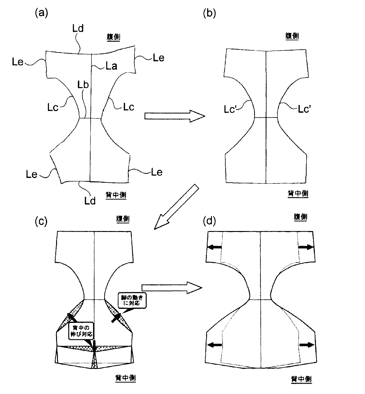 おむつ1は、股下部の両側縁が円弧状に湾曲しており、全体として長手方向中央部が内方に括れた砂時計状の形状となっている。表面シート2及び裏面シート3はそれぞれ、吸収体4の左右両側縁及び前後両端縁から外方に延出している。表面シート2は、その幅方向の寸法が、裏面シート3の幅方向の寸法よりも小さくなっている。その結果、表面シート2の左右両側縁2a,2bは、裏面シート3の左右両側縁3a,3bよりも、幅方向の内方で終端している。