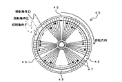 RMW40の詳細構造を図2に示す。この図2に示すように、RMW40は、回転軸43、この回転軸43と同心円に配置された円筒部材44、及び回転軸43に取り付けられRMW40の半径方向に伸びた複数の翼(本実施例では3枚)45を有している。これらの翼45はその周方向における幅が径方向外側に行くほど広くなるように(すなわち円筒部材44側が回転軸43側よりも広くなるように)形成されており、径方向外側の端部は円筒部材44の内周面に取り付けられている。また、RMW40の周方向における翼45,45間には、それぞれ開口46が形成されている。すなわち、1つのRMW40には3枚の翼45の相互間に形成された開口46が3つ存在する。これら開口46も周方向における幅が径方向外側に行くほど広くなるように形成されている。