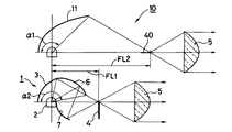 図2は本発明の車両用灯具1が、小型化できると共に、光束利用率も向上させ光量も増加させることが可能となる理由を模式的に示すものであり、図中に符号10で示すものは比較例であり、例えば回転楕円面などとした1枚の第一のリフレクタ11と遮光板40と投影レンズ5とで形成した従来技術の車両用灯具10である。