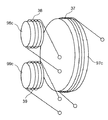 図4〜図9は、前記各コイル37〜39およびそれが巻回されるコア47〜49の構造を示す斜視図である。図4で示す構造では、1次側コア47aが、独立した複数の2次側のコア48a,49aとそれぞれ磁気回路を形成するために、1次側コア47aは同一方向に延びる一対の突起59,60を相反方向に2組備えたI字状に形成されており、これに対応して、2次側コア48a,49aは、同一方向に延びる一対の突起61,62を有するコの字状に形成され、それぞれの突起59,60;61,62が対向して磁気回路が形成される。前記突起59,60の断面積は突起61,62の断面積以上に形成され、高い磁気結合率を実現でき、伝送効率のよいシステムを実現できるようになっている。