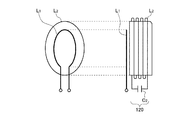 給電コイル回路120は、給電コイルL2とキャパシタC2が直列接続された回路である。エキサイトコイルL1と給電コイルL2は互いに向かい合っている。エキサイトコイルL1と給電コイルL2の距離は10mm以下と比較的近い。このため、エキサイトコイルL1と給電コイルL2は電磁気的に強く結合している。給電コイルL2の巻き数は7回、導線の直径は5mm、給電コイルL2自体の直径は280mmである。エキサイトコイルL1に電流I1を流すと、給電コイル回路120に起電力が発生し、給電コイル回路120には電流I2が流れる。同図矢印にて示す方向を正方向、反対方向を負方向とする。電流I1の向きと電流I2の向きは逆(逆相)である。電流I2は電流I1よりも格段に大きい。給電コイルL2とキャパシタC2それぞれの値は、給電コイル回路120の共振周波数fが13.56MHzとなるように設定される。