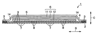 そして、これら表面シート2および中間シート4には、これら表面シート2および中間シート4の縦方向Aおよび横方向Bのそれぞれに向けて等間隔に複数の孔7,8がそれぞれ形成されている。これら複数の孔7,8は、表面シート2および中間シート4の厚さ方向Cに向けて貫通してそれぞれが等しい大きさに形成されている。また、これら複数の孔7,8は、これら複数の孔7,8の開口率が、例えば2%以上6%以下となるように表面シート2または中間シート4に形成されている。