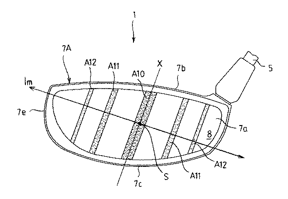 図3では、ヘッド7を正面視した際の慣性モーメントが最大となる方向をImで示している。なお、慣性モーメントが最大となる方向は、本来、ヘッド本体7Aの重心Gを通過するが、本発明では、その方向性とフェース部の反発係数との関係に特徴があることから、図3で示すImは、重心Gを通過する最大慣性モーメントの方向と平行で、かつスイートスポットS(重心Gからフェース部に垂線を下ろした点で定義される)を通過するように示してある。