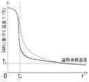 このときのSARから決まる温度Tの分布に対してその高い熱伝導率を考慮すると、Tは図7の実線に示すようになる。ここで、点線は図6(b)に示した病変組織についてのSAR、すなわち病変組織の吸収エネルギー量から見た温度(即ちSARから決まる温度T)である。したがって、サファイヤによる熱の軸方向の放散効果が、鞘1の表面温度を下げる効果があることが分かる。加えて、外部導体4の間隙部7の近くに集中していた治療用アンテナプローブ24の表面の熱が、上述の鞘1の軸方向に伝達されることにより、軸方向にも病変組織を加温する領域が広がり、生体内の病変組織のより広い領域に渡って、一様に温熱治療を行うことができる。