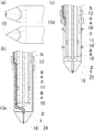 実施例8に係る、鋭利な先端部を有する鞘の、(a)ナイフエッジ形状を有する形態、(b)ナイフエッジ形状を有する別の形態、(c)円錐形状を有する形態、(d)曲線ナイフ形状を有する形態の、要部正面図及び要部側面図である。Example 8 of a sheath having a sharp tip, (a) a form having a knife edge shape, (b) another form having a knife edge shape, (c) a form having a conical shape, (d) a curve, according to Example 8. It is a principal part front view and principal part side view of a form which has a knife shape.