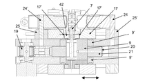 ポンピング運動が発生せず上記のようにポンプケージ(16)と支持体(17)との間に設けられる横方向の遊び(17’)に対応するいわゆる「アイドリングポンピング段階」とバルブの切換シーケンスを調整するために、溝部(40)(図17及び18)によって遊びが設けられ、入口又は出口ポート(5,5’)の閉止シーケンスの開始が、定量ポンプがストロークの終わりに達した直後に生じるように、正弦曲線の角度をシフトさせる。このような角度は、閉止及び開放シーケンスがアイドルポンピング段階の間だけに生じるように、閉止及び開放シーケンスを遅らせる。これにより、入口又は出口ポート(5,5’)の開放シーケンスの完了が、他のピストン(1,1’)に沿ったハウジング(2)の摺動による次のストロークの直前に確実に生じる。標準型の機構では、バルブがポンピング運動がまだ生じている間に切り換わるため、精度の良くないポンプストロークを与える。 The so-called “idling pumping stage” and valve switching sequence corresponding to the lateral play (17 ′) provided between the pump cage (16) and the support (17) as described above without pumping motion. To adjust, play is provided by the groove (40) (FIGS. 17 and 18), and the start of the closing sequence of the inlet or outlet port (5,5 ′) occurs immediately after the metering pump reaches the end of the stroke. Thus, the angle of the sine curve is shifted. Such an angle delays the closing and opening sequence so that the closing and opening sequence occurs only during the idle pumping phase. This ensures that the opening sequence of the inlet or outlet port (5, 5 ') is completed just before the next stroke due to the sliding of the housing (2) along the other piston (1, 1'). In a standard type mechanism, the valve switches while the pumping motion is still occurring, thus giving an inaccurate pump stroke.