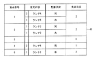 また、この配膳・オーダ管理情報41は、その一部の情報が、任意の食卓の客から注文を受ける際の、注文内容の入力等に利用するオーダ内容情報(料理内容情報)44としても活用される。なお、このオーダ内容情報44とは、例えば図5に示すように注文のあった食卓番号、注文内容、配膳状況を示す情報である。まだ注文を受付けていない段階では、オーダ内容情報44における注文内容、配膳状況はブランクのままとなる。図5は、本発明の実施形態を示すものであり、オーダ内容情報44の一例を示す図である。