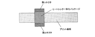 図13は、ヒートシンク一体化パッケージの熱コネクタの使用方法の一例を説明する図である。配線層を有するプリント基板の上には、抵抗、IC,コンデンサ、コネクタなどの電子回路素子と共に、上述した第2の実施形態のヒートシンク一体化パッケージが装着されている。このプリント基板が、筐体に固定されることになる。筐体自体を、上述したヒートシンク基板と同様な構成にすることができる。即ち、図示の筐体は、1枚の銅板を積層した構造となっており、その1枚の銅板を延伸させて、その延伸部を所定の形状に折り曲げることによりプリント基板取付部を構成している。 FIG. 13 is a diagram for explaining an example of a method of using the thermal connector of the heat sink integrated package. On the printed circuit board having the wiring layer, the heat sink integrated package of the second embodiment described above is mounted together with electronic circuit elements such as resistors, ICs, capacitors and connectors. This printed circuit board is fixed to the housing. The housing itself can be configured similarly to the heat sink substrate described above. That is, the illustrated case has a structure in which a single copper plate is laminated, and the printed board mounting portion is configured by stretching the single copper plate and bending the stretched portion into a predetermined shape. Yes.